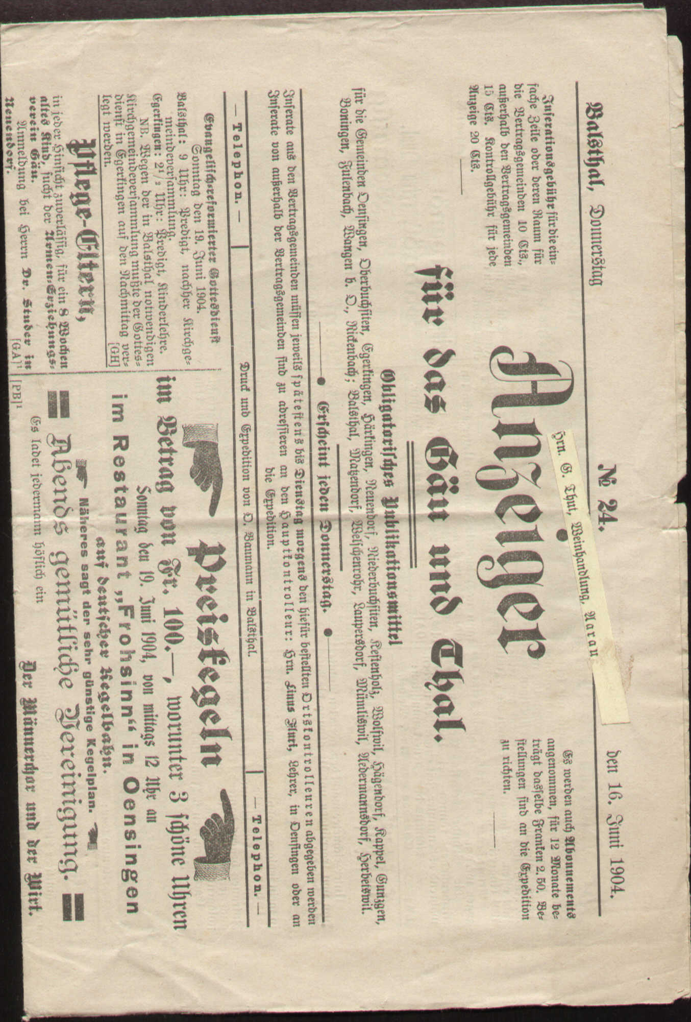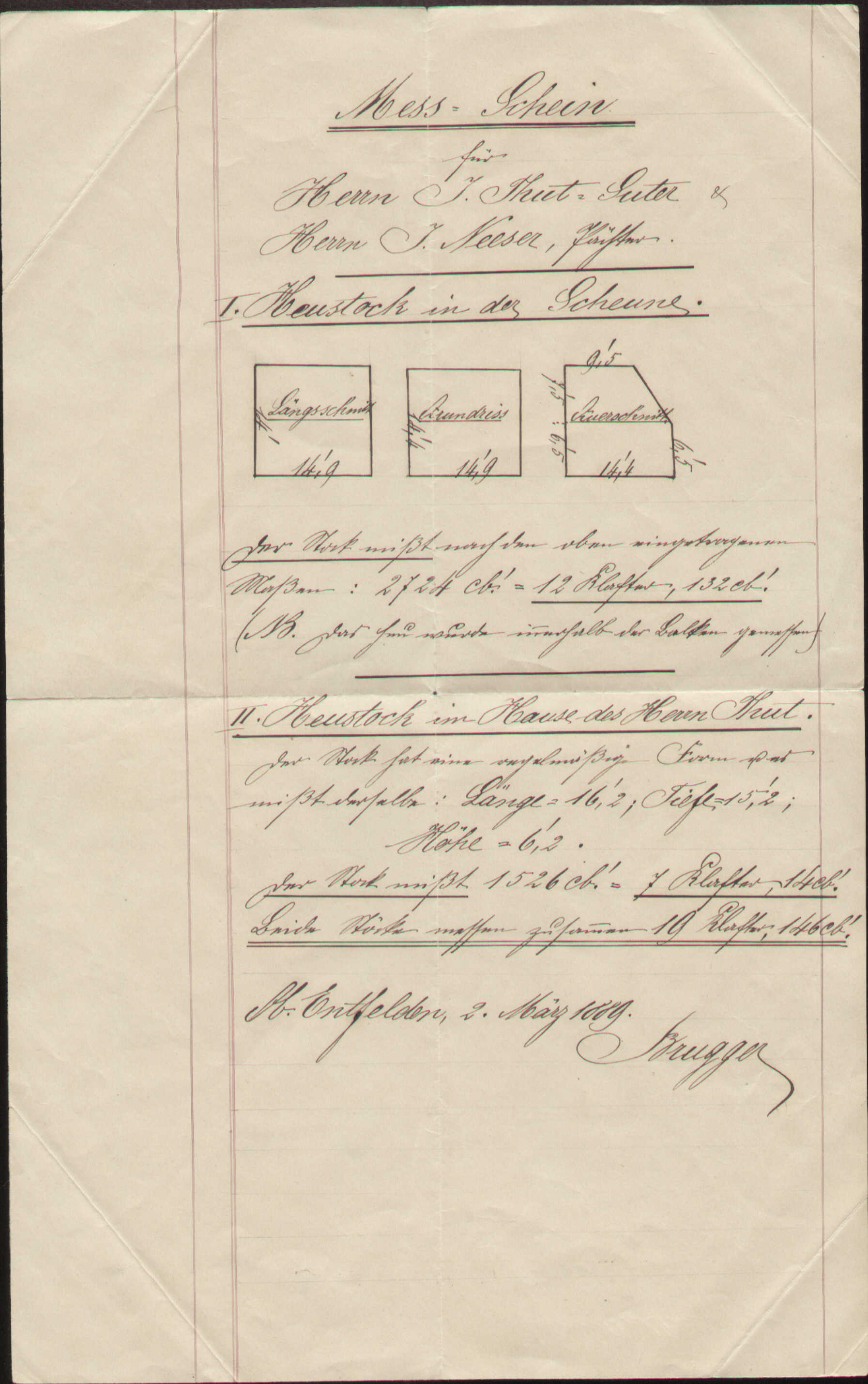 Mess-Schein Der Stock mißt nach den oben eingetragenen Maßen 2724 cbt = 12 Klafter, 132 cbt (NB. das Heu wurde unterhalb der Balken gemessen) ------------------- II. Heustock im Hause des Herrn Thut Der Stock hat eine regelmässige Form. Er mißt derselbe: Länge 16/2, Tiefe 15/2, Höhe = 6/2. Der Stock mißt 1526 cbt = 7 Klafter, ... Beide Stöcke messen zusammen 19 Klafter 146 cbt Oberentfelden 2. März 1889, Unterschrift: Brugger