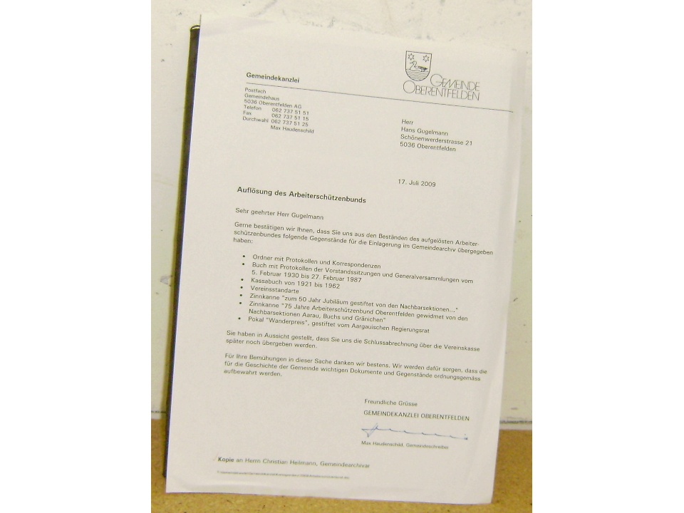 10.05.1911 Vereinsfahne Spender gesucht hier eingeklebt Protokoll über Anschaffung der Vereinsfahne des Gemischten Chors-Oberentfelden