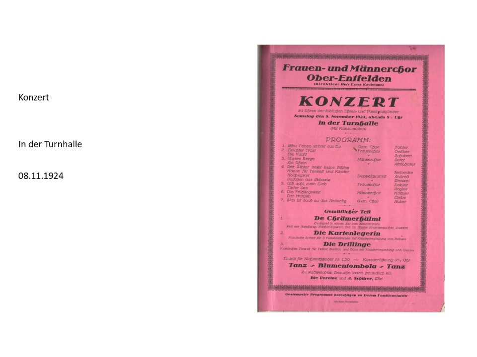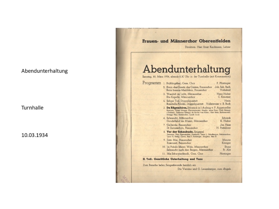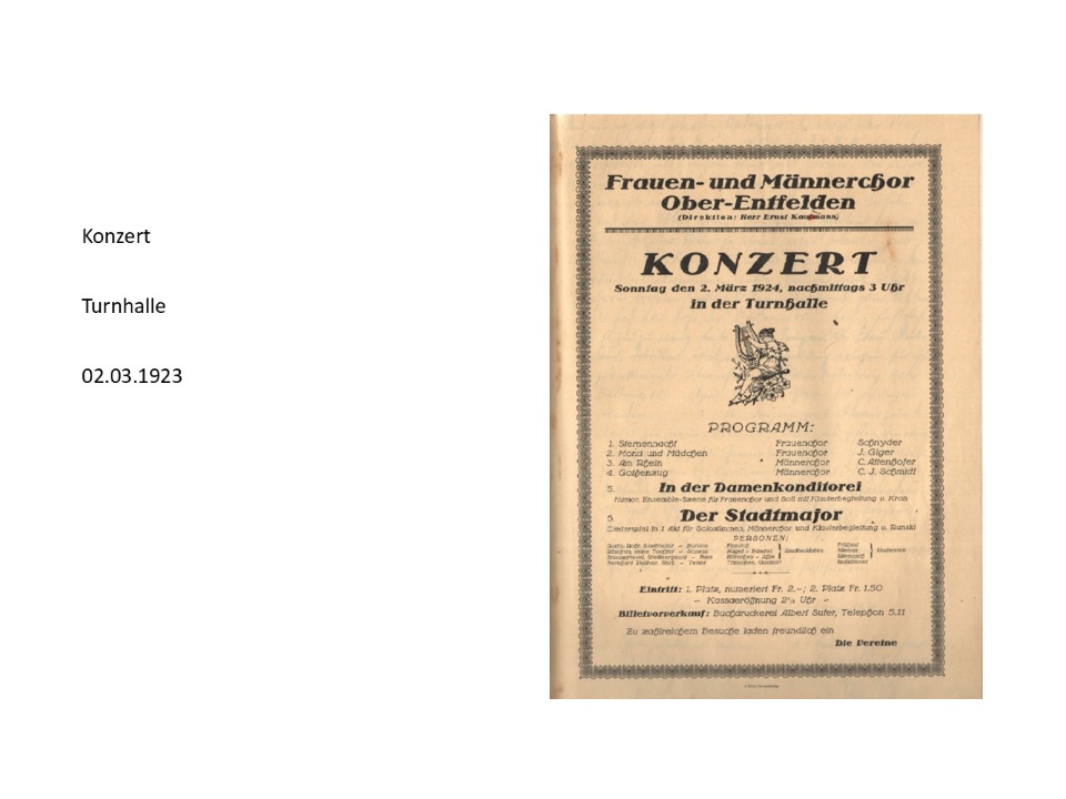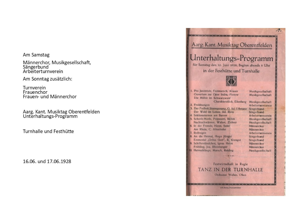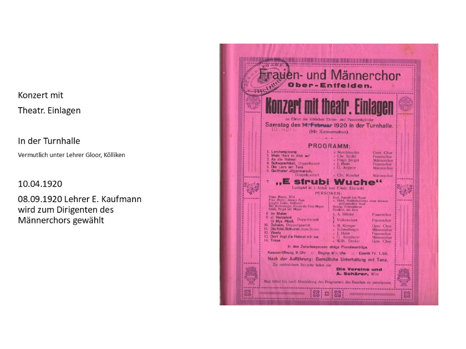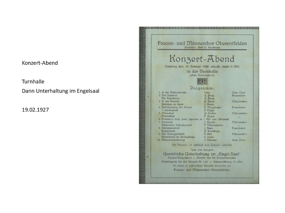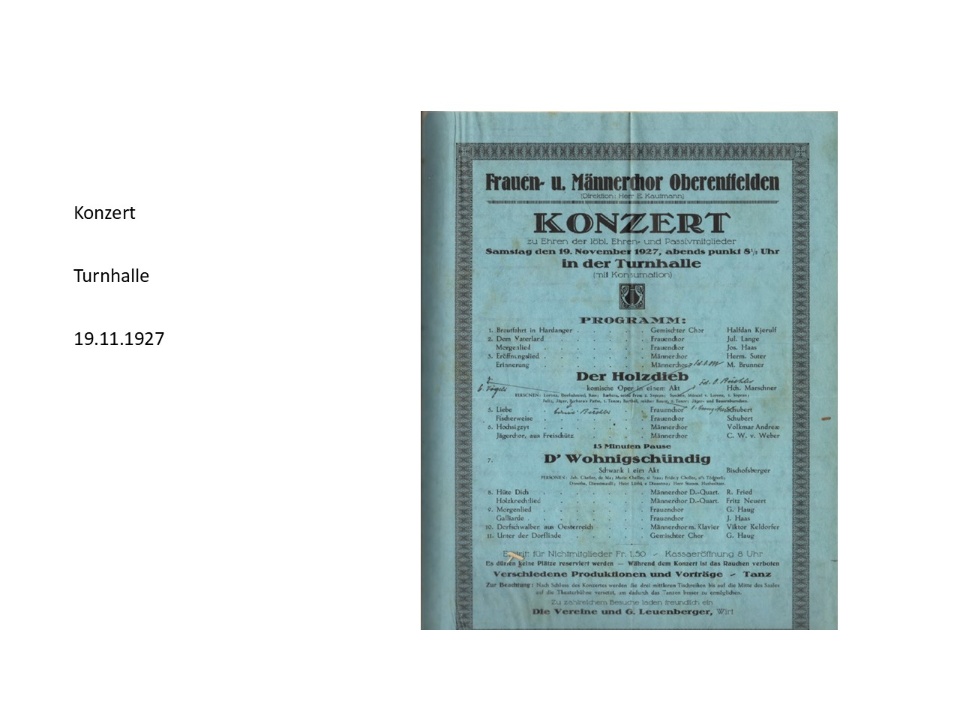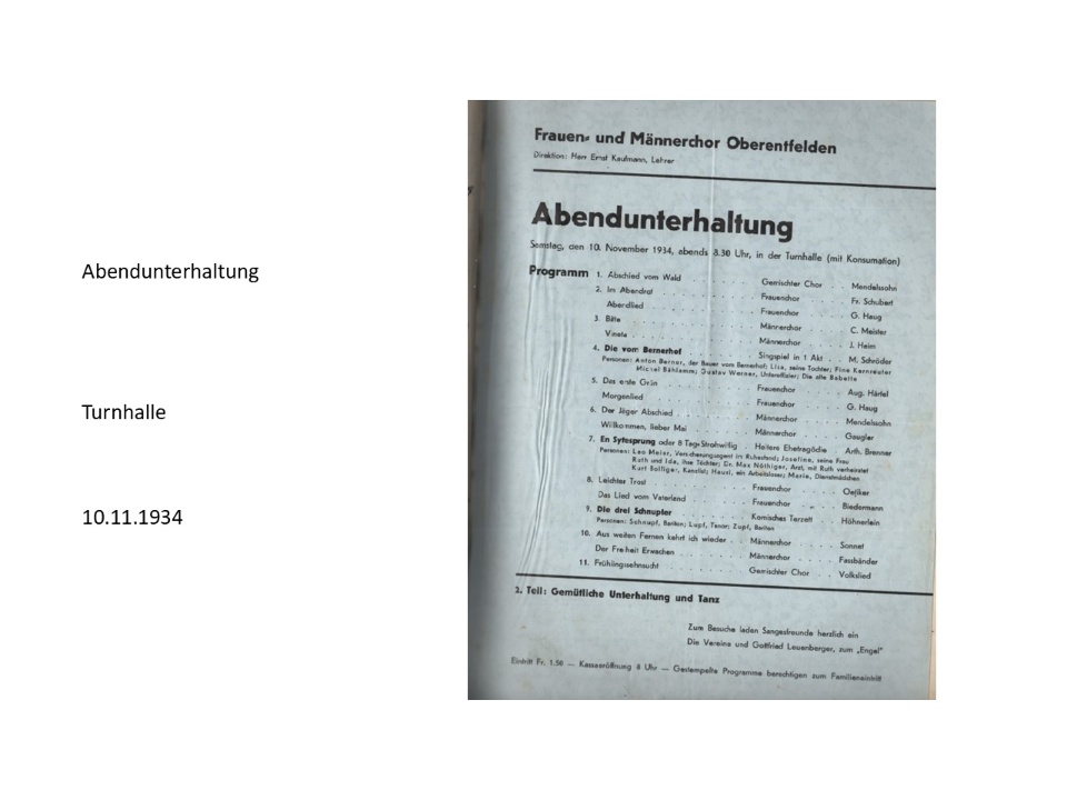 16.3. Abendunterhaltung in der Turnhalle: Bericht, Programm eingeklebt Direktion Karl Büchler, Wirtschaft Jb. Stuber; Angiolina Gerodetti, Aarau Sopran und