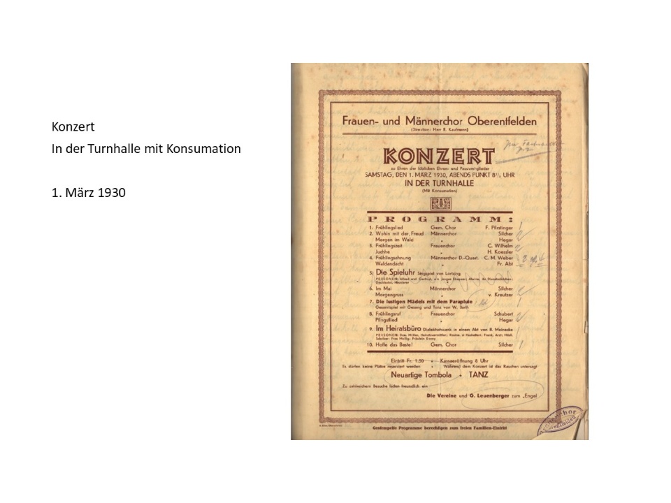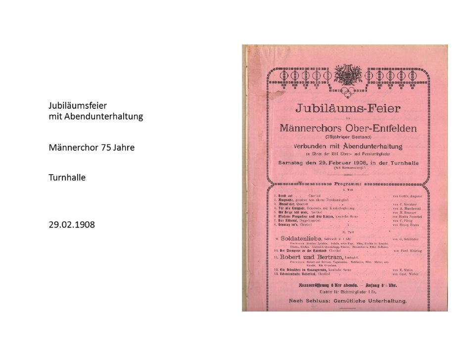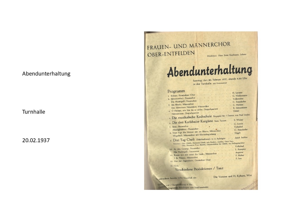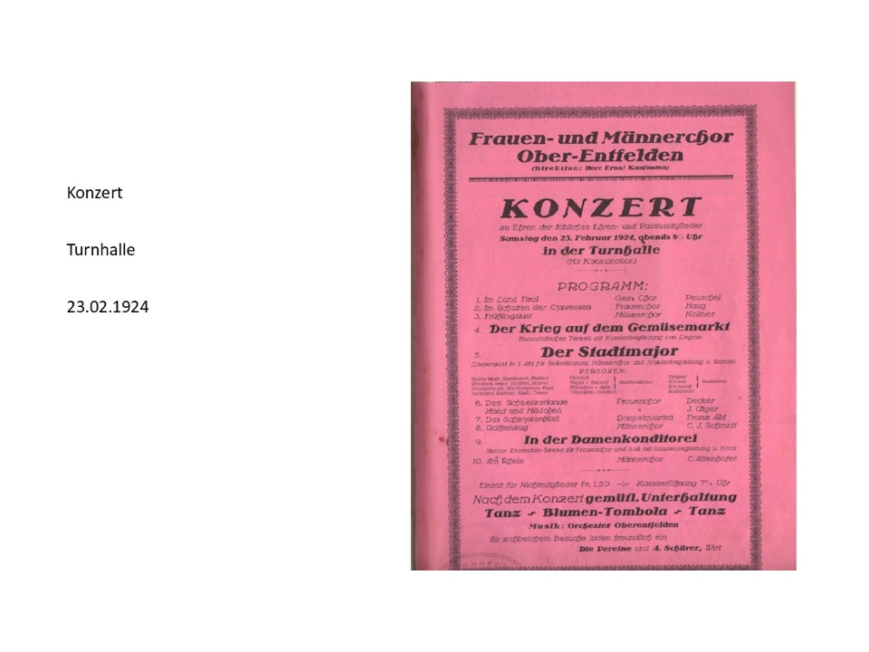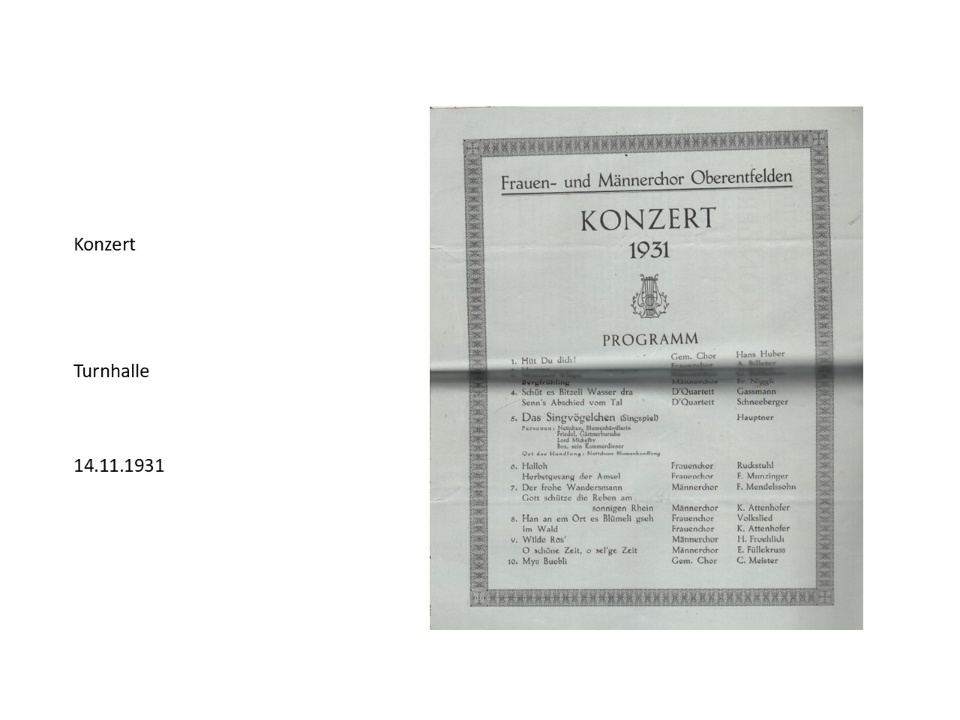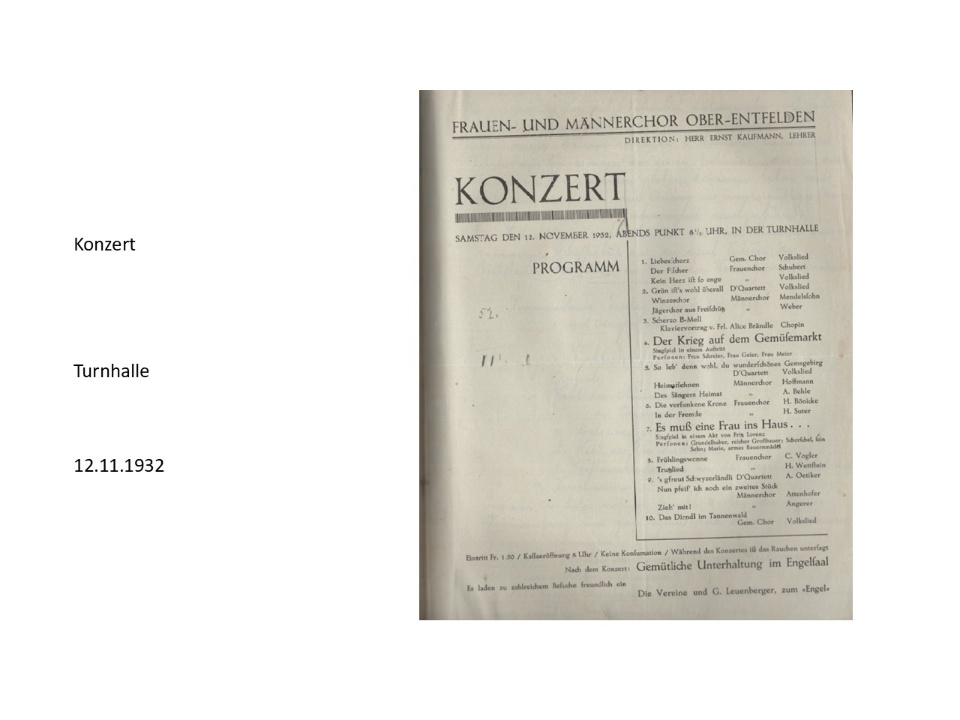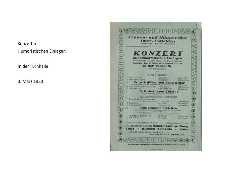 16.3. Abendunterhaltung in der Turnhalle: Bericht, Programm eingeklebt Direktion Karl Büchler, Wirtschaft Jb. Stuber; Angiolina Gerodetti, Aarau Sopran und