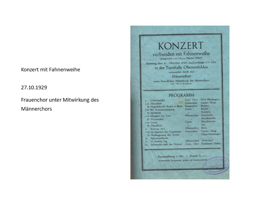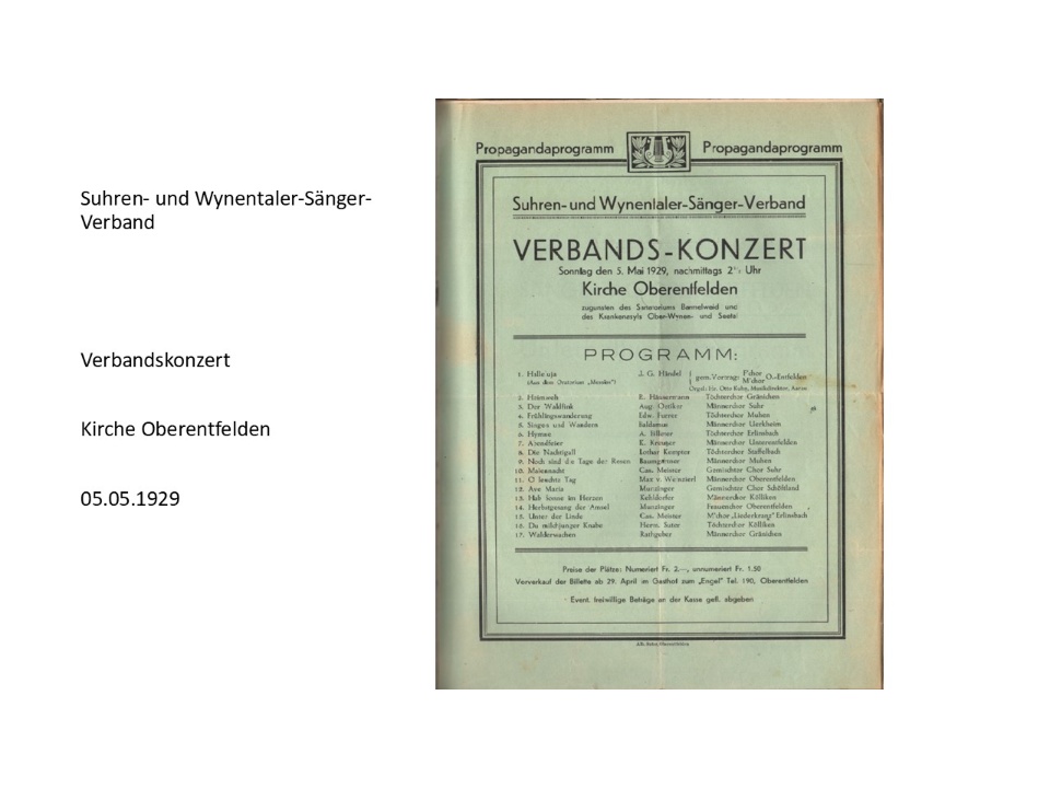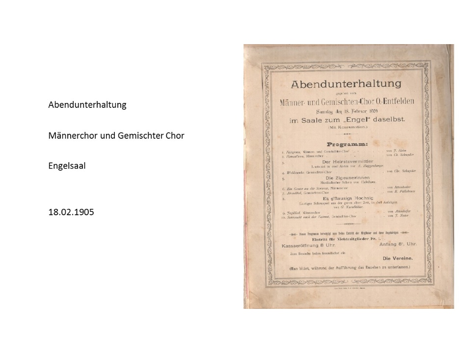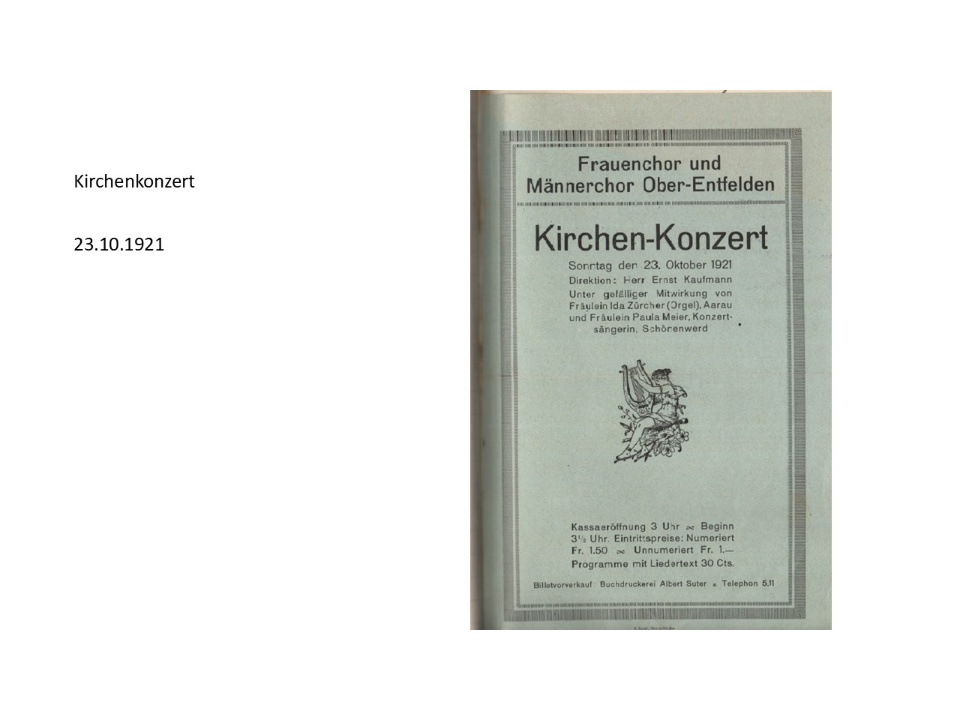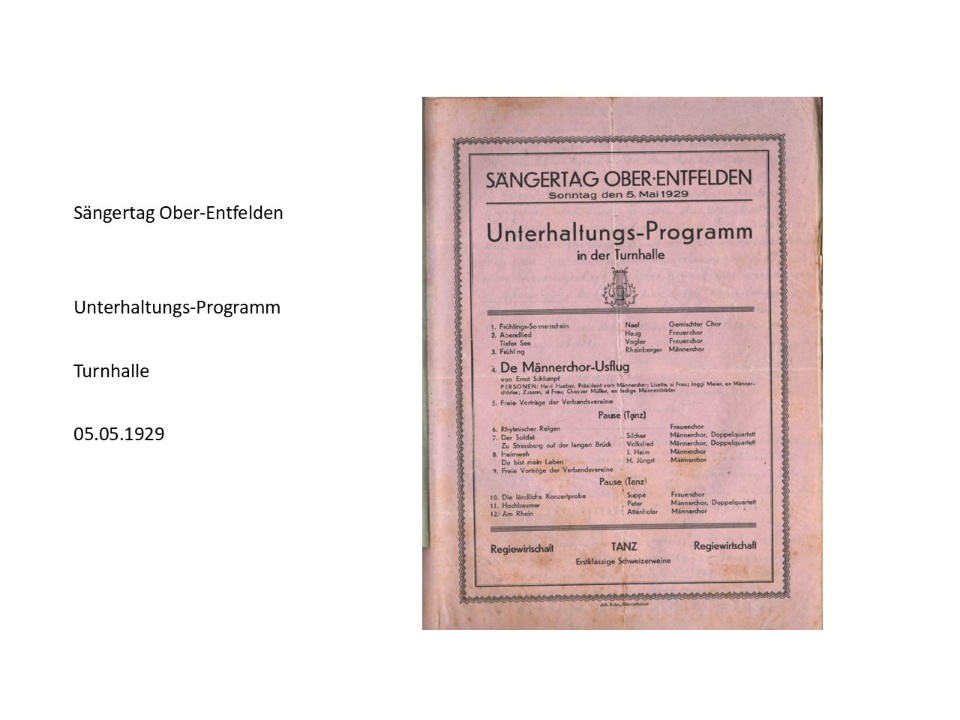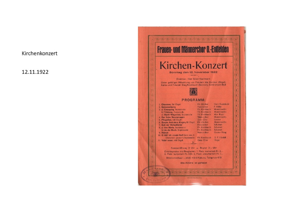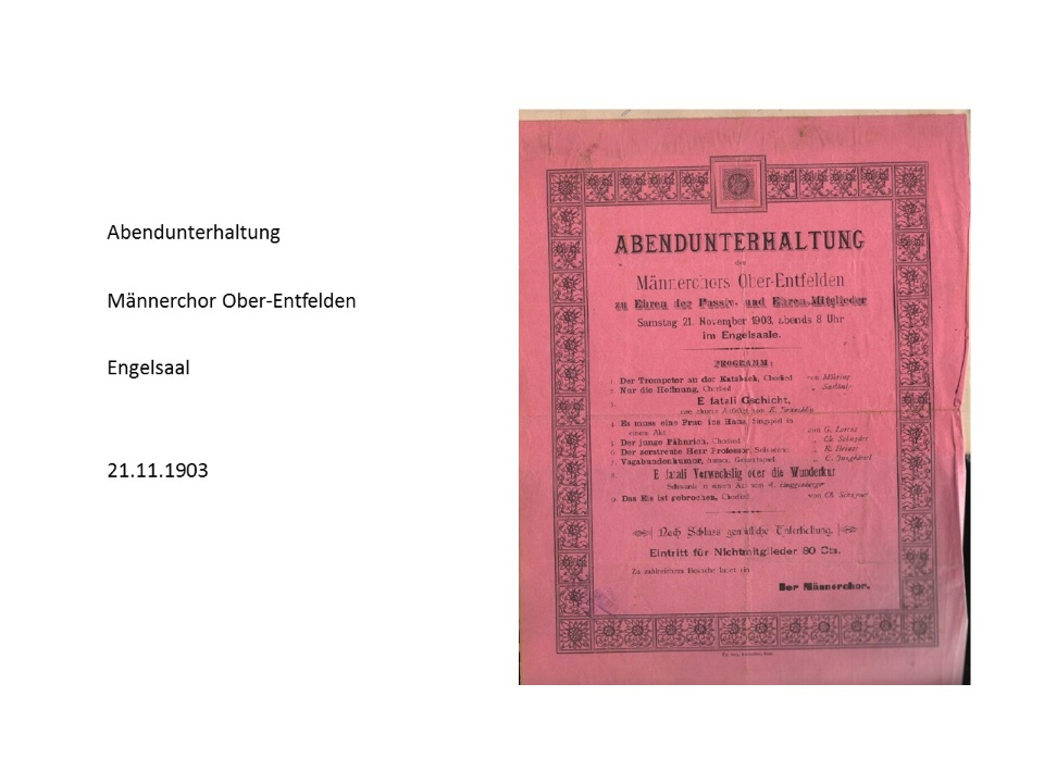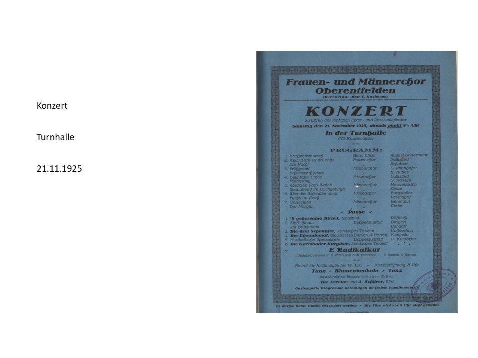 16.3. Abendunterhaltung in der Turnhalle: Bericht, Programm eingeklebt Direktion Karl Büchler, Wirtschaft Jb. Stuber; Angiolina Gerodetti, Aarau Sopran und